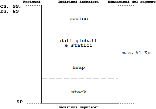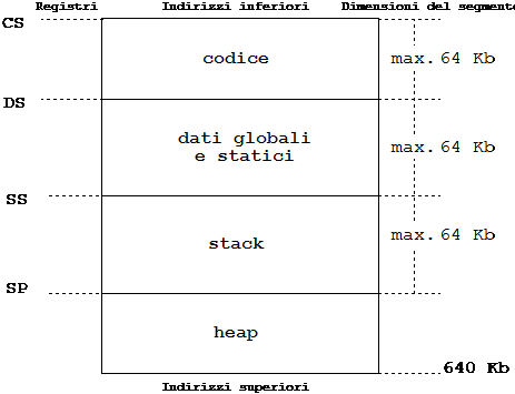 Tanto nei file .COM che nei file .EXE, codice, dati e stack non possono superare i 64 Kb e tutti i puntatori sono, per default, near. La memoria è dunque gestita secondo una 'mappa' analoga a quella presentata nella figura
