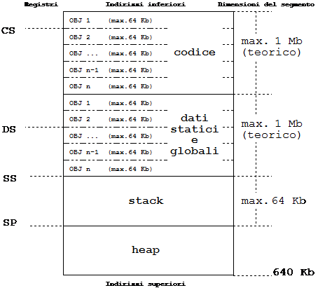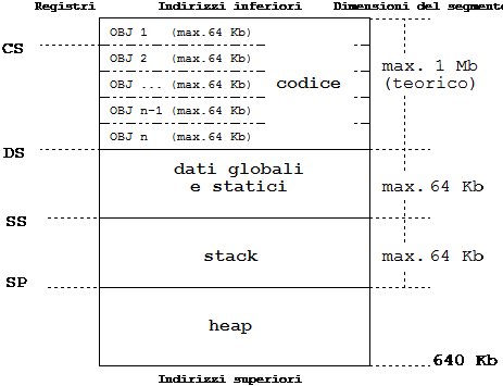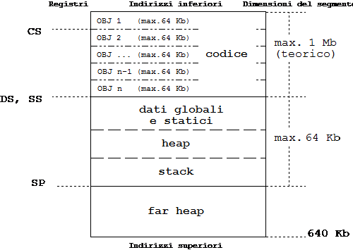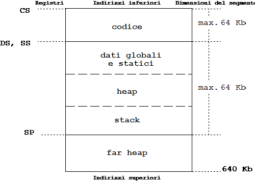 Come si vede dalla figura , anche nei programmi compilati in modalità small lo spazio utilizzato dai dati globali riduce heap e stack, e viceversa, ma il valore iniziale di DS ed SS non coincide con quello di CS, in quanto viene stabilito in base ai parametri presenti nella relocation table, generata dal linker. E' inoltre disponibile il far heap, nel quale è possibile allocare memoria da gestire mediante puntatori far