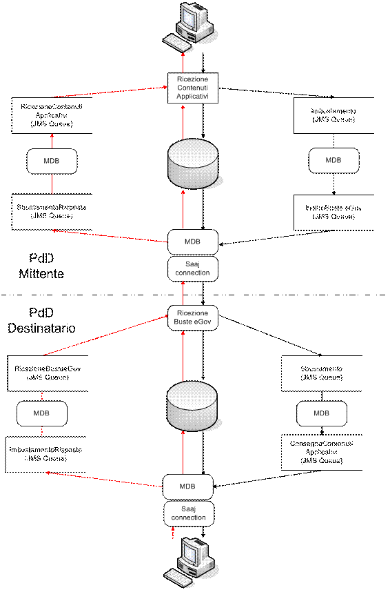 Infine il modulo di controllo della Porta di Dominio è implementato in modo da ricordare il modello SEDA, con il processo suddiviso in moduli Event Driver Bean (EDB) che implementano porzioni della logica ben definiti separati da code JMS. Questo approccio consente di svincolare il numero di richieste accettate dal numero di thread attivabili. Una gestione così modulare si presta ad operazioni di load balancing, operando sui pool di thread in ascolto su ogni coda. L'attuale implementazione prevede che le code JMS siano persistenti, ma è in previsione un'implementazione che consenta di renderle volatili, pur mantenendo la robustezza del sistema.