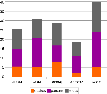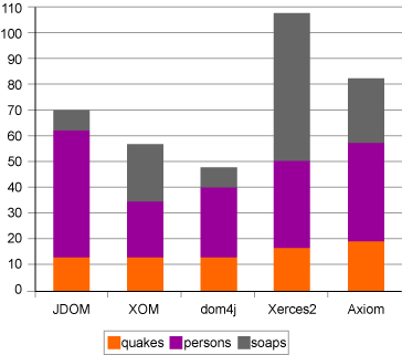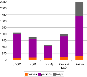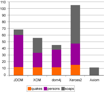 Dom4j è indiscutibilmente il migliore, come Axiom il peggiore. La sua elevata occupazione di memoria è dovuta a due fattori: primo, il parser deve essere referenziato dal documento costruito, quindi una sua istanza deve essere in memoria finché l'istanza del documento è in uso; secondo, i singoli oggetti del modello sono più "pesanti" in termini di memoria delle corrispondenti controparti negli altri modelli.