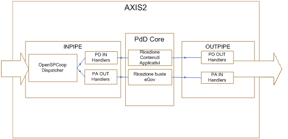 Inizialmente è stato compiuto un porting di OpenSPCoop usando le soluzioni standard di Axis2, quindi usando l'implementazione LLOM di AXIOM, inserendo gli handlers in un modulo e inserendo un dispatcher personalizzato per indirizzare i messaggi ai giusti servizi. Il grafico seguente mostra solo alcuni componenti, oltre a quelli standard,
