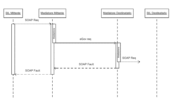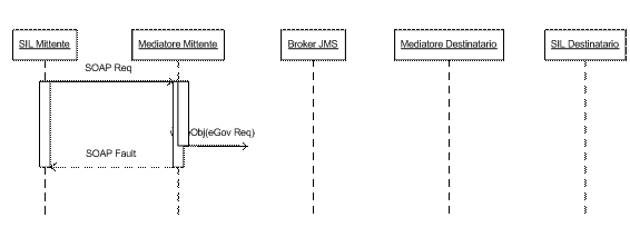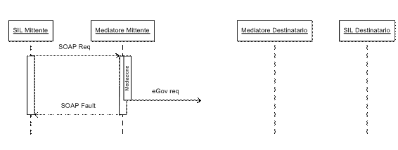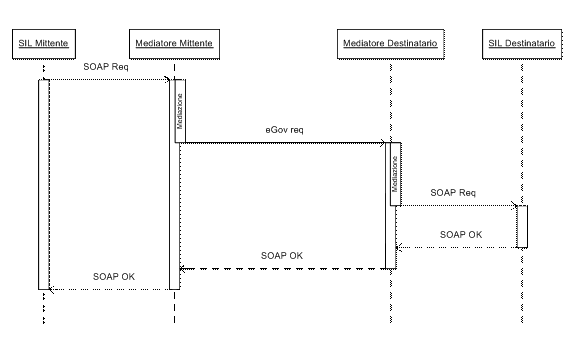 Come mostrato in questo diagramma di sequenza, il mittente invia al mediatore il messaggio e si mette in attesa dell'ack SOAP. Il mediatore applica le proprie politiche di mediazione e costruisce così la busta eGov secondo le specifiche SPCoop e le inoltra al mediatore di destinazione, sempre con una comunicazione OneWay, aspettando un riscontro. Il Mediatore di destinazione procede alla ricostruzione del messaggio orginale ed alle operazioni di corredo. Infine, consegna il messaggio al destinatario che, in caso di successo, riscontra il messaggio con un ack SOAP che verrà propagato indietro, al mediatore del mittente ed al mittente, chiudendo così le connessioni aperte e rispettando il paradigma OneWay.