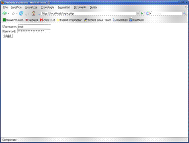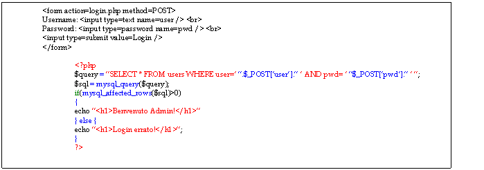 Il form è molto semplice: ha solo due campi, uno per l'username e uno per la password. I dati immessi verranno passati al codice php nelle variabili rispettive $_POST['user'] e $_POST['pwd'].