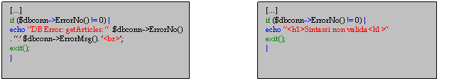 Questa vulnerabilità non è affatto grave e non è sfruttabile in quanto il programmatore, prima di mandare in output i risultati, controlla ciò che l'utente manda in query. Però mostra alcune informazioni che dovrebbero rimanere riservate, quali il numero dell'errore e ciò che causa l'errore. In questo modo l'SQL Injection si può benissimo trasformare in Cross Site Scripting. Altre tecniche di protezione dall'SQL Injection sono anche i settagli che si danno al php.ini. Infatti nelle recenti versioni del PHP è stata inserita la variabile booleana "magic_quotes". Questa variabile serve per gestire proprio queste situazioni. Infatti, se settata su false (corrispondente ad Off), il carattere speciali come l'apostrofo (') viene trasformato in (') prima che entri in query, salvando così l'integrità della query originale da mutamenti esterni.