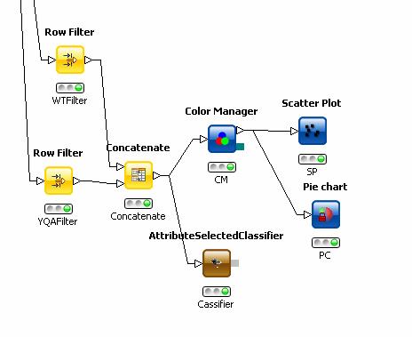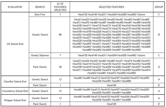 Allo scopo di poter estrapolare diversi gruppi di features per un successivo confronto, abbiamo utilizzato il blocco AttributeSelectedClassifier che ci permette di far variare sia le strategie di ricerca con cui ci si muove all'interno dello spazio di ricerca per la composizione dei gruppi, sia gli evaluators per la valutazione del potere discriminante dei gruppi di features.