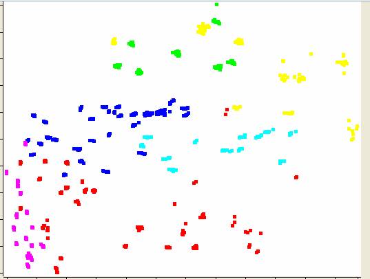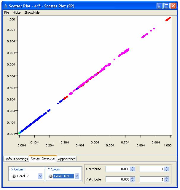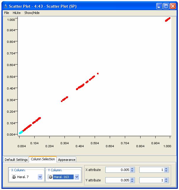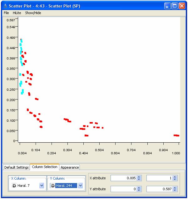 Applicando un Evaluator di tipo Wrapper Subset Eval e un algoritmo di ricerca di tipo Rank Search è stata individuata la feature Haral7. Prima di etichettarla come definitiva si è visto graficamente come tale features fosse mutuamente indipendente dalle singole features già selezionate (ma ciò non vuol dire che non possa essere indipendente da una qualsiasi loro combinazione). Ad esempio il grafico corrispondente alle features Haral7 e Haral244 è il seguente: