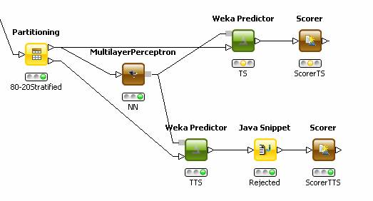 NOTA3: In figura 5, sul ramo inferiore, abbiamo inserito lo JavaSnippet tra lo Scorer e il Predictor per valutare l'accuratezza tenendo già conto degli errori di classificazione dovuti al rigetto, come da semantica del problema; se togliessimo lo JavaSnippet le percentuali di errore sarebbero, ovviamente, leggermente più basse.