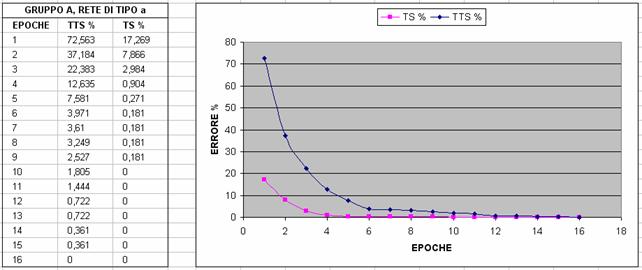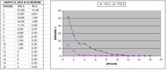 NOTA1: Il fatto che in ogni caso l'errore vada a zero e ci si stabilizzi supponiamo sia dato dal fatto che TTS e TS siano molto simili come distribuzione. Infatti, anche andando a variare di molto il numero di epoche (anche di vari ordini di grandezze) non si verifica overtraining cioè l'errore commesso sul TTS è sempre di 0%.