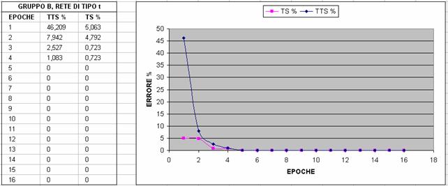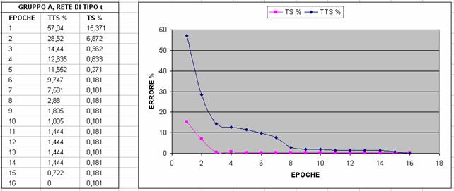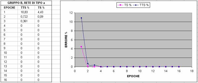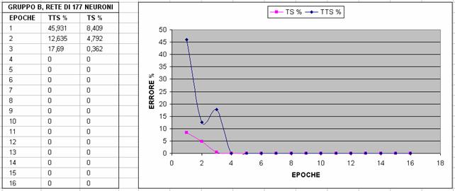 Dai risultati in tabella, abbiamo deciso di addestrare la rete con un numero di epoche pari a 15 che da un lato ci da' un errore risultante dalla cross-validation pari a 0.145 (quindi più che accettabile) e dall'altro riteniamo che ci copra dal rischio di overtraining; infatti guardando la figura 8 si può vedere che a 15 epoche il TTS ha da poco raggiunto un errore percentuale pari a 0% e il fatto che ci si stabilizzi supponiamo sia dato dal fatto che TTS e TS sono molto simili tra loro e che per questo l'effetto dell'overtraining non sia visibile con un numero limitato di epoche.