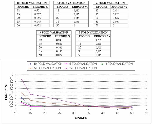 Adesso non ci resta che settare il numero di epoche: abbiamo deciso di scegliere questo parametro effettuando diverse cross-validation al variare del numero di epoche per avere dei risultati statisticamente più significativi. I risultati sono riassunti tabellarmente nella figura sottostante: