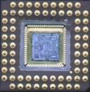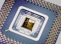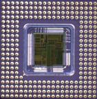 Il sofisticato Pentium Pro 200-MHz con 1-MB di cache integrata (notare i 3 die che lo compongono, quello della CPU da 5.5 milioni di transistor, a sinistra, e gli altri due die da 512-KB di cache ciascuno).