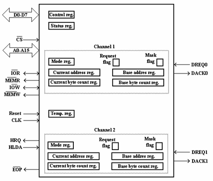 La differenza sostanziale, tra l'Intel 8237 e il componente da noi simulato, è il minor numero di canali, che sono stati ridotti da 4 a 2 ed i modi di trasferimento che sono i seguenti: single e block. In Fig. 21 è mostrato il suo modello con i registri e le linee fisiche simulate.