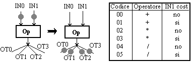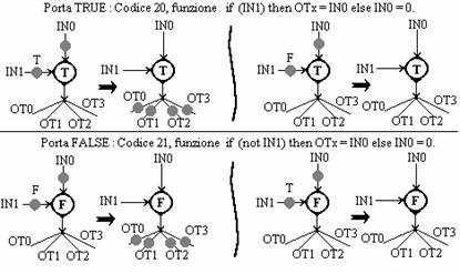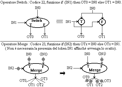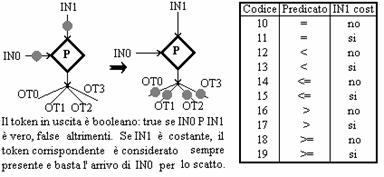 svolta dal nodo. Ad esempio, se la funzione f prevede due operandi, solo IN0 e IN1 vengono utilizzati; quando sono arrivati entrambi i dati (token) sui link corrispondenti, viene eseguita l' operazione f(IN0,IN1); il risultato viene contemporaneamente scritto sui registri di uscita ed inviato ad eventuali nodi connessi ai link; infine IN0 e IN1 vengono riportati al valore 0. Nel caso in cui una funzione prevede che una variabile sia costante, il registro che la contiene non viene azzerato. Se un nuovo dato arriva in un registro di ingresso prima che il dato precedente sia stato elaborato, il dato precedente viene perso. Le regole di scatto e le funzioni disponibili (con relativo codice) sono riportate nelle figure 13, 14, 15, 16.