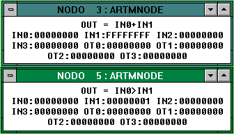 La finestra associata ad ARTMNODE (17Fig. 46) riporta la funzione svolta dal nodo e tutti i registri (compresi quelli non utilizzati); il contenuto dei registri può essere modificato utilizzando il comando Modifica Valore del menù Nodo; si osservi che la modifica diretta è equivalente all' arrivo del dato sul link corrispondente al registro modificato, cioè produce gli stessi effetti.