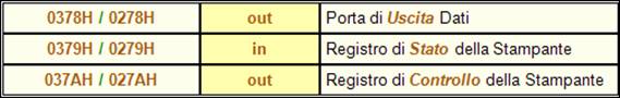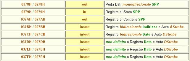 Le porte EPP hanno 8 Registri; ritenendo che l'indirizzo Base (il primo della serie) sia 0378H per la porta0 (LPT1) e 0278H per l'eventuale porta1 (LPT2).