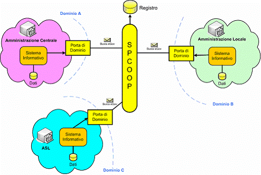Uno dei componenti principali della specifica SPCoop è la Porta di Dominio (PdD), che delimita il confine di responsabilità di un ente o soggetto amministrativo e racchiude al suo interno tutte le applicazioni da esso gestite. Le comunicazioni da e verso un dominio devono quindi attraversare la sua Porta di Dominio. Le PdD si parlano tra loro scambiandosi richieste e risposte in un formato standard, denominato busta eGov, che è sostanzialmente una specializzazione di un messaggio SOAP, esteso con un apposito header per definire le caratteristiche del protocollo SPCoop.