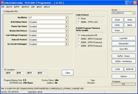 Il Micro Code Studio cioè il software da noi utilizzato per compilare i programmi in linguaggio Basic può salvare il programma sia con estensione .bas che con estensione .hex, è proprio quest'ultima che verrà caricata nel microcontrollore nel nostro caso utilizzando il software PIC FLASH fornito con la demo board della Mikroelettronika (EasyPIC). Le operazioni utili a caricare il programma nella flash del PIC sono: