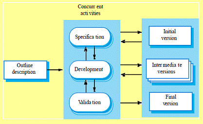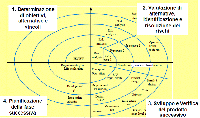 Il processo è rappresentato come una spirale, piuttosto che una sequenza di attività con retroazioni. Ogni giro nella spirale rappresenta una fase del processo. Non prevede fasi prefissate a priori (come la specifica o il design) ma i cicli sono definiti in base al caso specifico. C'è una esplicita gestione dei rischi che vengono valutati e risolti durante tutto il processo.