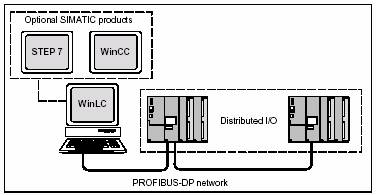 WinLC offre una soluzione computer-based per i progetti di automazione e, come mostrato in figura, è possibile collegarlo attraverso una rete profibus-DP alle unità di I/O distribuite e tramite queste al processo.