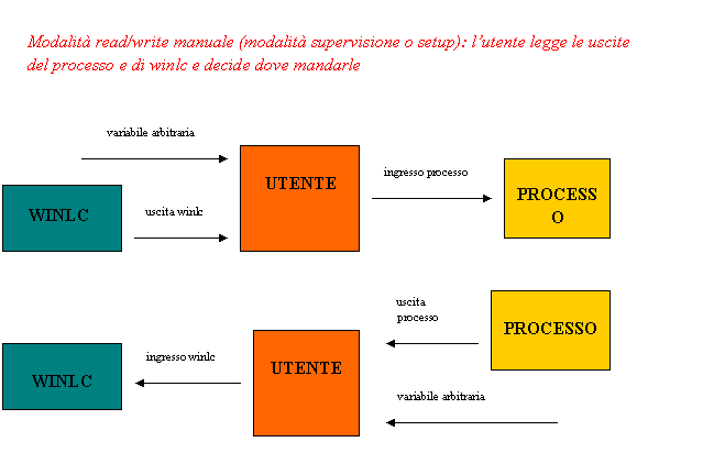 Non avendo a disposizione un processo reale, però, nel nostro progetto questo schema non viene rispettato: oltre ad utilizzare gli OCX di computing per interfacciare winlc all'utente, noi li adoperiamo per interfacciarlo al processo, leggendo le uscite di WinLc per inviarle al serbatoio e scrivendo negli ingressi di WinLc quanto ci arriva dal serbatoio stesso.