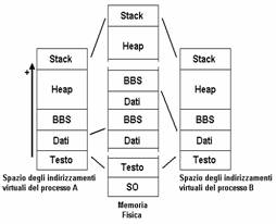 Nello spazio di indirizzamento di ciascun processo, dal basso verso l'alto, trovano posto nell'ordine il testo, i dati, i BSS e poi spazio vuoto fino al limite dello stack, posto in testa allo spazio di indirizzamento: dati due processi che condividono il testo, nella memoria fisica, dal basso verso l'altro, troviamo nell'ordine il SO, il testo condiviso, dati e BSS del primo processo, dati e BSS del secondo processo e poi lo stack.