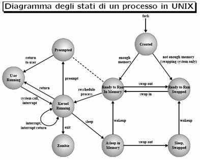 Più sinteticamente gli stati di un processo Unix sono: Ready (pronto per essere eseguito), Running (in esecuzione su una CPU del sistema), Sleeping (in attesa di un evento), Swapped (parte del processo é stato trasferito su disco, per liberare la memoria per altri processi), Terminated (terminato, il segnale SIGCHLD è stato inviato al processo padre), Zombie (terminato, ma il padre non ha raccolto il segnale SIGCHLD, per cui il processo mantiene ancora allocate delle risorse).