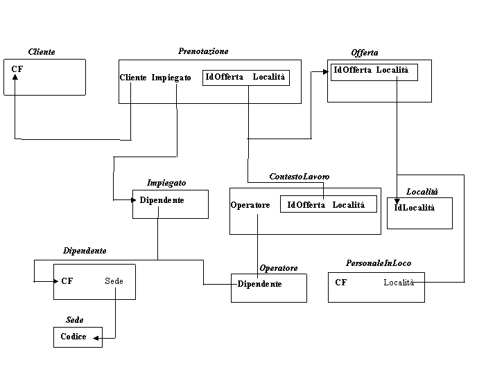 Tra queste entità esistono le relazioni di Prenotazione, di Destinazione, di Contratto, di Contesto lavoro e di Collocazione.