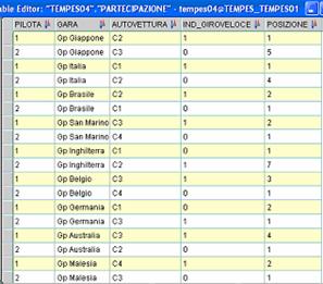 Ogni gara è contraddistinta dal nome (es. 'G.P. Italia'), dal luogo in cui si svolge (es. Monza) e dalla data. Si vuole tenere traccia della partecipazione di un pilota ad una data gara, che si suppone avvenga guidando una e una sola macchina. Tuttavia, in gare diverse, un pilota può guidare auto diverse. Inoltre, si vuole tenere traccia dell'eventuale vittoria di un pilota del team in una determinata gara. Per ogni gara, si vuole tenere traccia del giro veloce, registrando anche il tempo ottenuto. Nel caso in cui il giro veloce sia stato ottenuto da un pilota del team, se ne vuole tenere traccia.