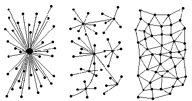 In un sistema centralizzato, tutti i segnali passano da un unico punti. In un sistema decentralizzato, un punto 'vicino' può essere raggiunto attraverso un nodo periferico, ma un punto 'remoto' può essere raggiunto solo passando dal centro (evidentemente da 'distanza' non è determinata tanto dallo spazio fisico quanto dalla struttura del sistema). In una rete distribuita, l'informazione può percorrere molte strade diverse e scegliere in ogni momento il percorso più adatto per arrivare a destinazione, indipendentemente dalla distanza. Questo è il modello su cui è costruita la struttura dell'internet.