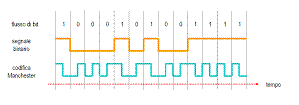 il segnale non viene codificato come 1 = tensione alta, 0 = tensione bassa ma 1 = transizione dall'alto al basso e 0 = transizione dal basso all'alto, in questo modo avendo il clock su cui il segnale è modulato, diviene più semplice separare i bit.