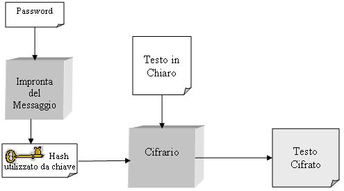La cifratura con password utilizza una combinazione tra cifrature hash e normale cifratura. Acquisita la password calcoliamo il suo digest con algoritmo del tipo SHA-1 o MD5, quindi utilizziamo il risultato di questa operazione come chiave con cui inizializzare un cifrario. Una volta inizializzato il cifrario è possibile andare a cifrare la chiave.
