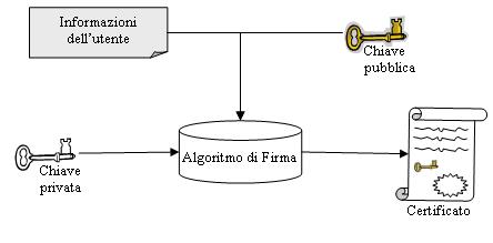 I certificati digitali legano tra loro una chiave pubblica ad un particolare identificatore di persona o ente, e rappresentano la garanzia, fornita da terze parti, che questo legame è autentico. Le terze parti a cui si fa riferimento sono particolari autorità dette Certification Authority, il cui scopo è quello di garantire l'affidabilità di una chiave di un certo ente o persona. L'affidabilità della chiave per essere garantita deve sottostare a rigidissime regole di scurezza e integrità. In Figura 2‑ riportiamo lo schema di principio per la costruzione di un certificato firmato con la chiave privata corrispondente alla chiave pubblica certificata: