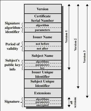 Di seguito viene riportato uno schema che specifica i campi contenuti in un certificato X.509 con le rispettive versioni: