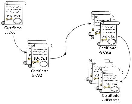 Ogni autorità di certificazione presenta un proprio certificato, il root, con il quale certifica gli altri certificati. Quindi un'autorità nota, come ad esempio Verisign, può utilizzare il certificato root per convalidare il certificato di un altro ente che fornisce alcuni servizi tra cui la convalida di certificati privati dei singoli utenti. È importante tener presente che nel processo di verifica, ogni certificato della catena, ad eccezione del certificato dell'utente, è stato utilizzato come autorità di certificazione.