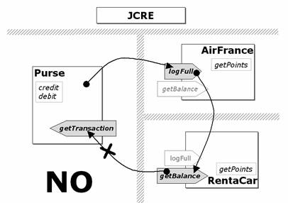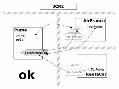 Neppure l'uso del metodo getPreviousContextAID all'interno del metodo getTransaction di Purse evita questo flusso non autorizzato di informazioni in quanto sia AirFrance che RentaCar utilizzano lo stesso metodo condiviso, in condizioni normali, per accedere, periodicamente, ciascuno alle proprie transazioni presenti nel transactionLog di Purse; dunque entrambe le applet avranno il proprio AID contenuto nella lista delle applet autorizzate ad accedere al servizio offerto dal metodo getTransaction.