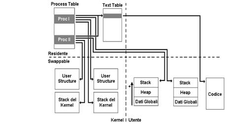 Ogni processo è costituito da 3 segmenti logici in ciascuno dei quali gli indirizzi sono contigui: il segmento testo (codice), il segmento dati e il segmento stack. Il segmento testo è a sola lettura (per evitare che ci siano programmi che si automodifichino) e può essere condiviso da più processi ottimizzando l'occupazione della memoria: la Shared Text Segment Table o STST è una tabella contenente i riferimenti ai segmenti testo condivisi, ovvero per ciascuno di essi conserva informazioni utili alla localizzazione su disco, il numero di processi che lo condividono e puntatori ai descrittori di questi processi; tutti i processi che condividono lo stesso segmento testo contengono nei rispettivi descrittori un puntatore alla stessa entry della STST. Il segmento dati è inoltre diviso in due parti, dati inizializzati e dati non inizializzati (BSS).