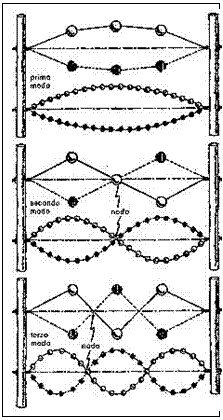 Una corda di chitarra o di violino in vibrazione si può benissimo considerare costituita da un numero grandissimo di perline infilate l'una accanto all'altra, e possiamo sfruttare i vantaggi del procedimento seguito da Daniel Bernoulli applicando a questi vibratori più musicali ciò che abbiamo appena scoperto. La figura mostra come i primi tre modi di vibrazione di un filo con venti palline assomiglino notevolmente a quelli del sistema a tre palline. Non occorre un grande sforzo di immaginazione per ricavare da queste immagini quelle che rappresentino le situazioni analoghe per un filo con cento o diecimila palline, e cosi via fino ad arrivare, per facili gradi, a un filo liscio e uniforme, di cui possiamo ignorare la struttura molecolare. Ho fatto notare che in un qualsiasi modo di vibrazione tutte le particelle si muovono, con moto armonico semplice alla stessa frequenza: in generale, però, si trova che le varie palline si muovono con ampiezze diverse e che, in realtà, alcune non si muovono affatto. Lo si vede chiaramente nella figura: nel secondo modo di vibrazione, per esempio, la pallina centrale rimane sempre ferma.