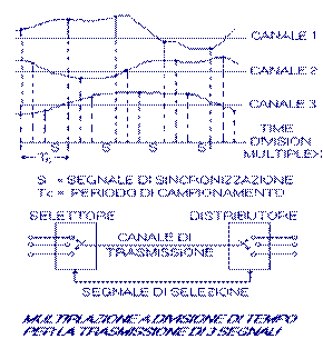 Con la tecnica della multiplazione a divisione di tempo (time-division multiplexing) è possibile utilizzare un unico canale per la trasmissione di più segnali. Attraverso un commutatore (multiplexer) i segnali vengono campionati sequenzialmente ed inviati in sequenza al canale di trasmissione dove un decommutatore (demultiplexer), con esso sincronizzato, ne permette la suddivisione e la ricostruzione in ricezione. Ciò significa che durante il periodo di campionamento di un segnale vengono effettuati i campionamenti degli altri segnali in trasmissione. Quindi il comando di commutazione dovrà operare ad una frequenza multipla della frequenza di campionamento dei singoli canali. |