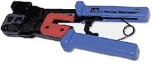 Si usa un connettore di tipo RJ 45, simile a quelli telefonici, ma più grande. Qui sopra ne trovate due diverse esecuzioni. Anche in questo caso, il metodo di trasmissione del segnale è CSMACD. La velocità di trasmissione va da 10 Mbps a 100 Mbps, consentiti solo dal tipo CAT 5. Quando comprate un cavo UTP (che è conforme alle specifiche 10BaseT e si chiama anche così) e specialmente se di tipo CAT 5, controllate le specifiche sulla guaina o chiedete al fornitore una fotocopia delle specifiche dichiarate dal produttore. In caso di dubbio, rivolgetevi al produttore direttamente: il Web è uno strumento potente e democratico. Il cavo di tipo CAT 5 costa più di un coassiale, ma è indispensabile se la rete deve avere una velocità di trasferimento dati di 100 Mbps: in questo caso, la rete è di tipo Fast Ethernet, e deve essere conforme alle specifiche 100BaseT. Quando vi installano una rete, chiedete sempre che durante il collaudo venga rilevata strumentalmente l'effettiva capacità di trasferimento di segnale. Non è detto che schede da 100 Mbps e cavi UTP CAT 5 garantiscano 100 Mbps. Interferenze e diafonia possono abbassare il transfer rate. In questo caso, è necessario utilizzare un cavo STP per raggiungere le prestazioni desiderate. Come nel caso del coassiale, potete acquistare cavi UTP già terminati ed in metraggi standard o prepararveli da soli. Vi servono al solito il cavo, venduto anche a bobine, dei connettori RJ 45 e le pinze di crimpaggio specifiche: attenzione: non sono uguali a quelle usate per i coassiali. Date un'occhiata qui sotto.