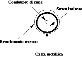 Cavo coassialeE' un altro comune mezzo di trasmissione; offre un miglior isolamento rispetto al doppino e quindi consente velocità di trasmissione maggiori su distanze superiori. E costituito da un conduttore centrale in rame circondato da uno strato isolante all'esterno del quale vi è una calza metallica.