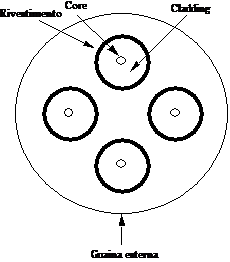 Se non volete avere problemi e siete disposti ad adattarvi alla lunghezza del cavo, compratelo bell'e fatto. Altrimenti, fate qualche prova. Dovete togliere la guaina esterna per due centimetri, mettere a nudo la calza metallica, togliere con attenzione (senza tagliar via anche i fili di rame che stanno all'interno) il rivestimento protettivo in teflon per un centimetro, mettere a nudo il conduttore in rame, sistemare il connettore al suo posto bene bene e stringere il tutto con la pinza, che è fatta apposta e si adatta benissimo. Tutto qua. Fibre otticheUna rete può essere cablata anche in fibra ottica. Questi cavi non subiscono né attenuazione né diafonia, non sono sensibili alle interferenze elettromagneriche perché i dati vengono diffusi mediante impulsi luminosi. Tuttavia, costano moltissimo. Sono uno dei mezzi più recenti, e stanno rivoluzionando il mondo delle telecomunicazioni. Sono fatte di un sottilissimo cilindro centrale in vetro, (core) circondato da uno strato esterno (cladding) di vetro avente un diverso indice di rifrazione e da una guaina protettiva. Sono quindi raggruppate insieme in una guaina contenitrice esterna.
