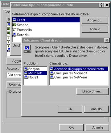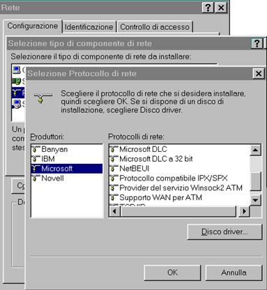 La parte software è costituita dal driver della scheda di rete (necessario per vedere la scheda di rete), da un client di rete e da uno o più protocolli. I protocolli più comuni sono: NetBEUI: serve per collegarsi alle vecchie reti Microsoft ed è quindi compatibile con il vecchio Netbios, creato nel 1984 da Microsoft per le reti Dos. IPX/SPX: serve per connettersi alle reti Novell. TCP/IP: è il protocollo usato in Internet e offre parecchi vantaggi. Conviene sceglierlo nella maggior parte dei casi. Per selezionare il protocollo, basta scegliere la voce