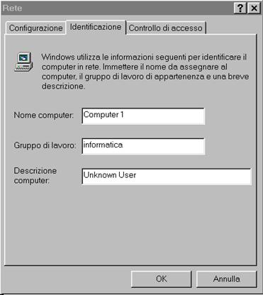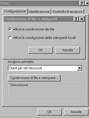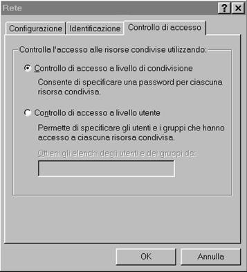 Per condividere i nostri archivi, dobbiamo condividere la cartella che li contiene (non possiamo condividere i singoli file). Selezioniamo la cartella, e dal menu File selezioniamo Condivisione (oppure: selezione cartella -> Tasto destro del mouse -> Condivisione). Si apre una finestra ove inserire il nome della condivisione (il nome con cui la risorsa sarà vista sulla rete), il tipo di condivisione (accesso solo in lettura, o in lettura e scrittura) e la eventuale password di accesso. La password può essere impostata per l'accesso in sola lettura, o in lettura e scrittura. Le due impostazioni convivono tranquillamente: possiamo avere utenti che accedono in sola lettura e altri che accedono in lettura e scrittura. Lo svantaggio della condivisione in una rete paritaria è il fatto che la password è unica per tutti gli utenti: tutti accedono alla risorsa con la medesima password. Il livello di protezione, pertanto, non è alto. Dopo poco tempo, la password della risorsa circola liberamente nella rete e può essere conosciuta facilmente. Volendo complicare un po' le cose, dalla scheda della configurazione di rete, possiamo attivare la scheda Controllo di accesso, che specifica come vogliamo che vengano condivise le nostre risorse. Abbiamo due possibilità: Controllo a livello di condivisione: è la scelta già esaminata, che imposta una password per ogni risorsa. Controllo di accesso a livello utente: è l'impostazione più completa ed efficace, in quanto consente di regolare la condivisione in funzione sia delle risorse, sia degli utenti che vi accedono. Tuttavia, essa richiede un server di Dominio.
