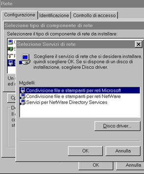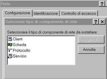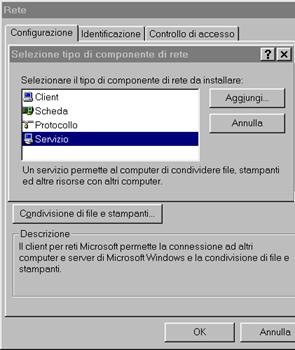 Per condividere risorse, bisogna per prima cosa impostare il computer per la condivisione. Dalla scheda Configurazione, premiamo il pulsante Aggiungi e selezioniamo Servizio. Otteniamo così l'elenco dei servizi disponibili e installabili.