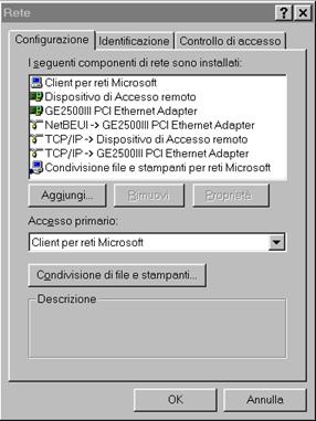 una velocità che va da 28.8Kbps a 56Kbps. Il modem LAN eguaglia il modem stand-alone, dato che si avvale della linea telefonica per collegarsi alle sedi remote. Il modem LAN, ad esempio, è sostanzialmente un ISDN o router analogico con hub Ethernet incorporato, grazie al quale gli utenti condividono le linee telefoniche e le connessioni modem. Il modem LAN si collega direttamente a ciascuna porta di rete Ethernet del computer: ne risulta una maggiore rapidità di trasferimento rispetto ai modem stand-alone. Il numero di utenti che possono condividere l'accesso alla WAN può essere aumentato ad un massimo di 25 utenti; basta collegare un hub 10BASE-T Ethernet ad una delle porte LAN del modem LAN. Il FirewallNodo configurato come barriera per impedire l'attraversamento del traffico da un segmento all'altro. I firewall migliorano inoltre la sicurezza della rete e possono fungere da barriera tra le rete pubbliche e private collegate. Possono essere implementati in un router o configurati a tal scopo come dispositivi di rete. Impiegando un firewall è possibile impedire gli accessi indesiderati, monitorare le sedi alle quali si accede più di frequente ed analizzare la quantità di larghezza di banda che la connessione Internet sta utilizzando. Software Il software di rete consente il collegamento l'uso delle risorse messe a disposizione dagli host. Il software è composto di una parte client e di una parte server. La parte server consente di condividere le risorse, la parte client di connettersi al server. Esistono vari software di rete, tra cui Novell, Banyan Vines, Microsoft, Lantastic. Dopo aver installato la scheda di rete, dobbiamo installare il software, in particolare il client necessario a collegarci al server che si trova nella nostra rete. Le impostazioni generali della rete si attivano mediante l'icona Rete dal pannello di controllo oppure, se la rete è già installata, selezionando l'icona Rete sul desktop, premendo il pulsante destro del mouse e quindi Proprietà. Si ottiene la seguente schermata.