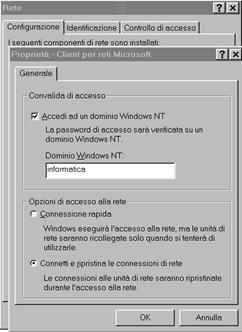 Per specificare che vogliamo accedere a un Dominio, dobbiamo utilizzare il menu Proprietà del Client per reti Microsoft (dalla scheda Configurazione di rete, selezionare Client per reti Microsoft, quindi Proprietà). Otteniamo la scheda qui riprodotta, in cui possiamo specificare il dominio NT che dovrà convalidare la nostra password e il tipo di connessione che si intende utilizzare. Una volta impostata la scheda con le giuste informazioni, verrà come al solito richiesto il CD di Windows e quindi il riavvio. Alla nuova partenza, verrà richiesto di inserire un nome utente (username) e una password, insieme a un dominio, che dovranno essere convalidati da un server che si trova nel dominio specificato.