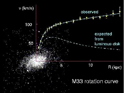 Velocità tangenziale delle stelle attorno al centro della galassia M33 in funzione della distanza dal centro. I punti con le barre di errore sono le misure sperimentali; sui punti è riportata la curva che meglio riproduce la dipendenza dalla velocità. La linea tratteggiata rappresenta la decrescita della velocità che ci si aspetta per le relativamente poche stelle che si trovano a distanze superiori alla dimensione media della galassia. Per maggiore chiarezza, l'immagine ottica della galassia è stata sovrapposta al grafico.