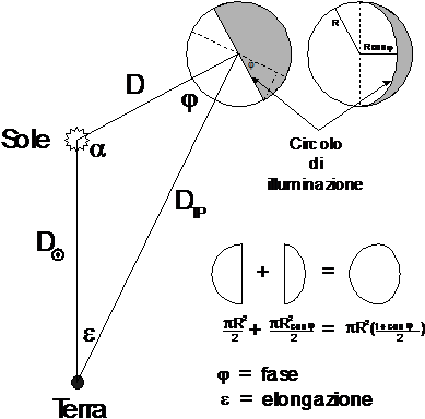 Nel caso dei pianeti interni (Mercurio e Venere) e di Marte è necessario tener conto delle fasi, cioè del fatto che, come avviene per la Luna, il disco planetario osservabile dalla Terra non è sempre completamente illuminato. Il circolo di illuminazione (perpendicolare alla direzione Sole-Pianeta), proiettato sul disco planetario osservabile dalla Terra, traccia su di esso una semiellisse di semiassi a = R e b = R cos j, dove j è l'angolo di fase, cioè l'angolo Sole-Terra visto dal Pianeta.