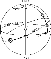 L'eclittica, il percorso apparente che il sole compie tra le costellazioni zodiacali in un anno. L'equatore celeste e l'eclittica giacciono su due piani inclinati di 23° 27' e si intersecano in due punti opposti detti rispettivamente punto (gamma) o punto d'Ariete o punto vernale e punto (omega) o punto di Bilancia o punto autunnale. Il punto d'Ariete è il punto che il sole occupa durante l'equinozio di primavera (21 marzo). Esso deve il suo nome al fatto che nell'antichità tale punto era situato nella costellazione dell'Ariete (attualmente si trova nei Pesci), il cui segno zodiacale è la lettera greca gamma () che ricorda la testa di un ariete. Il punto di Bilancia è il punto che il sole occupa durante l'equinozio di autunno (23 settembre). Esso deve il suo nome al fatto che nell'antichità tale punto era situato nella costellazione della Bilancia (attualmente si trova in Vergine), il cui segno zodiacale è la lettera greca omega () che richiama la forma di una bilancia.