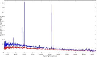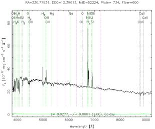 Figura 2 Lo spettro dell'oggetto 587727221937930688. Un esempio di spettro elettromagnetico che presenta evidenti emissioni Hα e Hβ